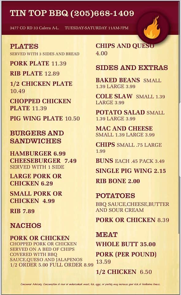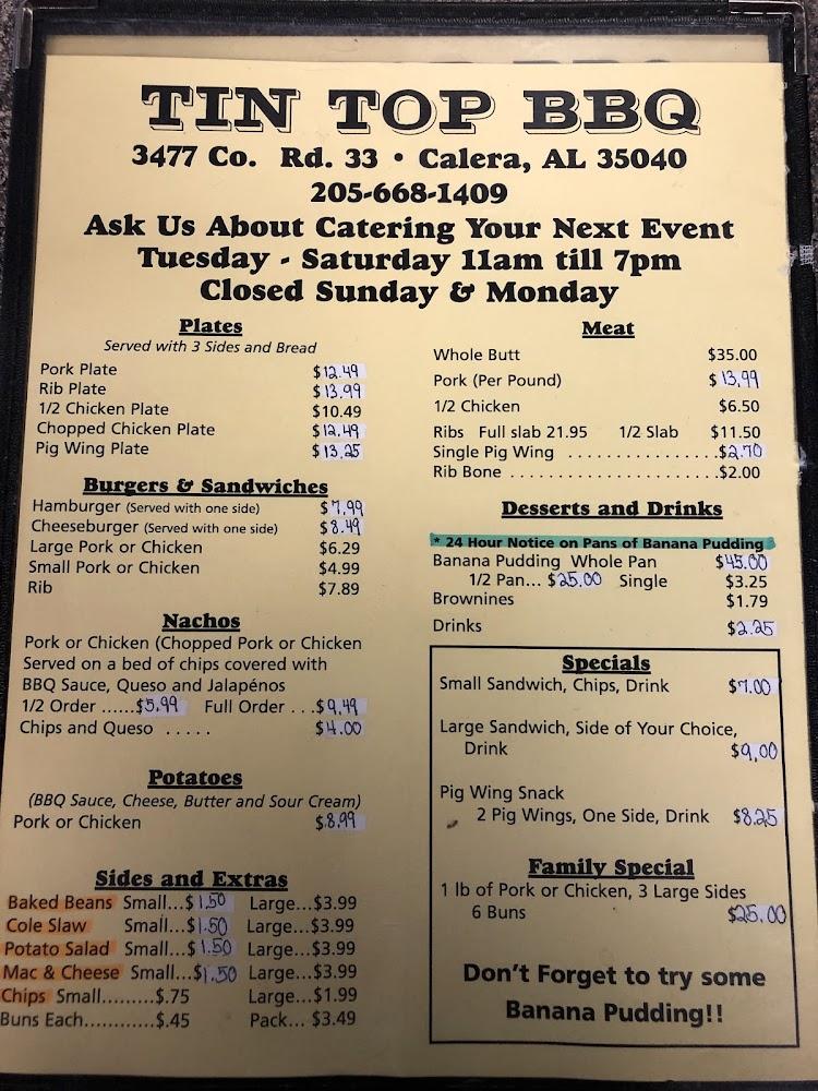 Welcome to Tin Top BBQ, your destination for mouthwatering grilled delights in Calera, AL! Located at 3477 Co Rd 33, we offer a cozy, laid-back atmosphere perfect for solo diners and groups alike. Indulge in our extensive menu featuring local specialties, quick bites, and shareable portions, all priced between $10 and $20. Enjoy your meal on our lovely terrace or opt for takeout and delivery services. We're proud to be accessible for everyone, and our family-friendly amenities include high chairs and a children’s menu. Join us for lunch or dinner and savor the true taste of BBQ!